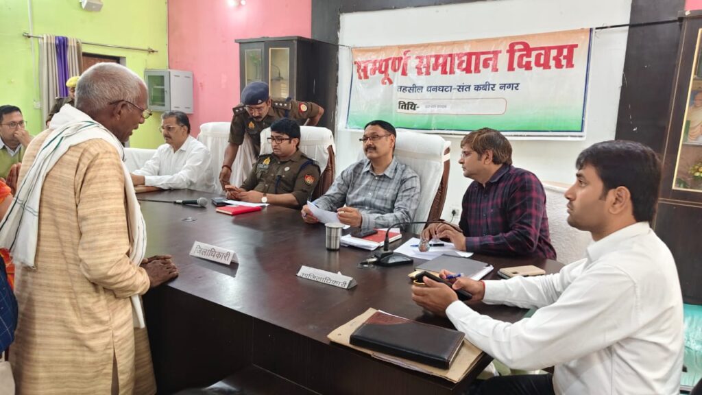 संतकबीरनगर । जनपद के धनघटा तहसील में शनिवार को जिलाधिकारी आलोक कुमार की अध्यक्षता में सम्पूर्ण समाधान दिवस का आयोजन किया गया। इस दौरान उन्होंने जनसामान्य की शिकायतों को सुनते हुए संबंधित विभागीय अधिकारियों को सभी प्रकरणों का निर्धारित समय सीमा के भीतर गुणवत्तापूर्ण निस्तारण सुनिश्चित करने के निर्देश दिए।
