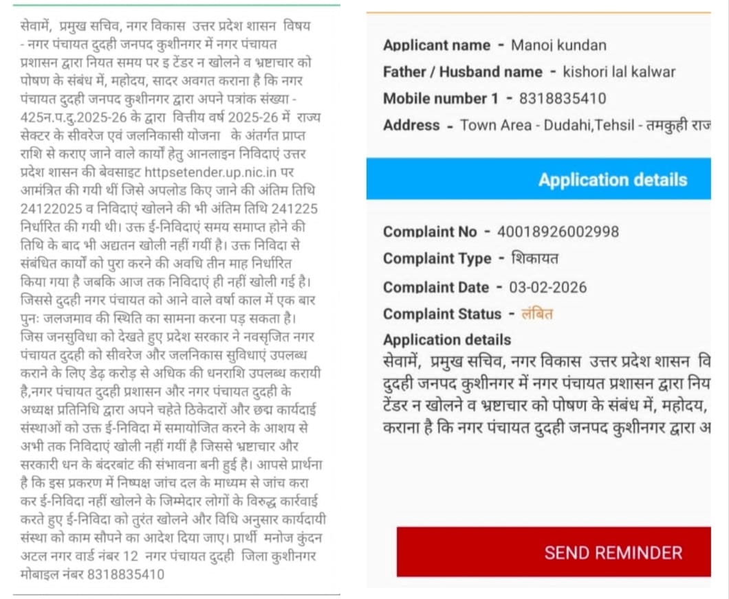समाजसेवी एवं टीम अटल के संयोजक मनोज कुंदन ने मुख्यमंत्री पोर्टल पर शिकायत दर्ज कराते हुए मांग की है कि पिछले वर्ष से अब तक हुए सभी ई-टेंडरों की जांच कराई जाए तथा कराए गए कार्यों का भौतिक सत्यापन कराया जाए, जिससे संभावित अनियमितताओं का खुलासा हो सके।
