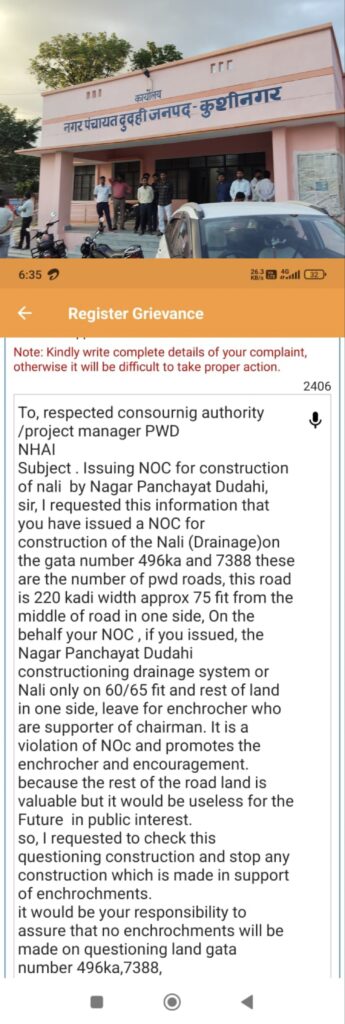 कुशीनगर। जिले के नगर पंचायत दुदही में नाली निर्माण को लेकर विवाद गहराता जा रहा है। एक स्थानीय व्यक्ति ने सार्वजनिक लोक निर्माण विभाग के संबंधित अधिकारी को पत्र भेजकर आरोप लगाया है कि गाटा संख्या 496 और सड़क संख्या 7388 पर नाली निर्माण के लिए जारी एनओसी की शर्तों का सही तरीके से पालन नहीं किया जा रहा है।